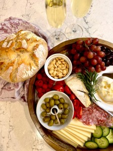 I cut into the boule and that crunch seemed to echo in the kitchen. Inside it was light and fluffy, with perfect holes that were begging to be smeared with the French salted butter I sourced from our local grocery store. It was the third successful loaf, so no longer could be deemed a stroke of luck, but victoriously climbing the learning curve. It was a simple achievement. Life is made up of many of those as the milestones are few and far between. As someone who makes any excuse to celebrate anything and everything, finally executing a golden, brown sourdough boule demands to be served with all the accompaniments of a charcuterie board, and with it, a bottle of bubbly.