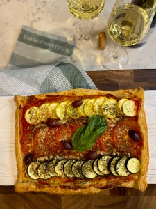 On each puff pastry sheet, spread mustard, then tomato sauce, and 1 tsp herbs de Provence, leaving approximately a 1” border. Place one row of squash, tomato and zucchini, retaining the border. Top veggies with 1 tsp herbs de Provence on each sheet. Then sprinkle with salt and Parmesan. Fold up the sides of the puff pastry and pinch the corners together. Drizzle the top with olive oil. Bake for approximately 25 minutes until golden brown. Top with a few olives and basil as a garnish.