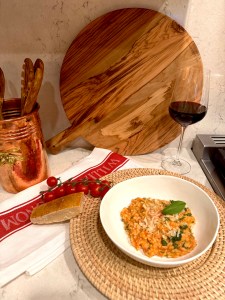 In a risotto pan or deep pan, melt the butter and olive oil. Add the shallot and cook until translucent, about 5 minutes. Add the garlic and cook until fragrant, about 1 minute. Add the salt. Stir in the rice and cook until lightly toasted, about 5 minutes. Pour in the wine to deglaze the pan and cook until almost completely absorbed by the rice, about 4 minutes. Add the cherry tomatoes and canned tomatoes – try and break up the cherry tomatoes with a wooden spoon, during the cooking process. Add the Parmesan rind. Slowly add in the vegetable broth about 1 cup at a time, until each is absorbed. Remove the rind and discard. Add the mascarpone and most of the Parmesan, leaving a little behind to sprinkle on each one’s dish. Stir in the chopped basil and finally, add salt and pepper to taste.